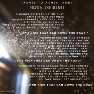 With my affection for the villanelle and the sestina, you’d think I’d be at ease working with a refrain, but perhaps it was something about a group-sourced refrain (hat tip to Poetry Sister Sara) that tripped me up. For whatever reason, the refrain in the Bop seems wholly separate from the stanzas… so much so, that I ended up hitting a wall at the end of my first stanza. Suddenly the fourteen-syllable lines seemed clunky, and the beats fell oddly. I started over, trimming my lines, but then the rhyme felt forced. Another draft, now completely unrhymed, but the internal rhythm and more polished language of my lines felt off when faced with that casually worded refrain. Isn’t that just the way it goes when you have a poetic form you’re certain will be simple? Eventually I got it to where I was …just done messing with it. I left the rhyme imperfect, with an off-meter step near the end of each stanza to signal that repeated refrain coming to pause the discussion again. Reminding myself these poems are meant to be exercise and not perfection, I stumbled and limped into my imperfectly perfect topic… housekeeping.