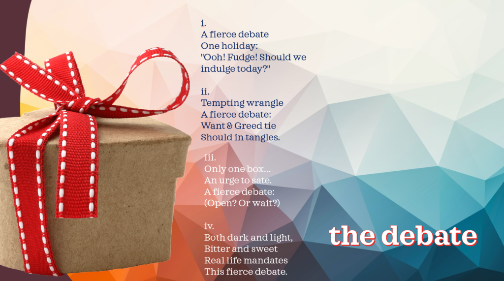 Our teaser last month was to let “box” inspire us. Since we just moved house in October, “box” is a lot less inspiring to me than it could be. I wasn’t sure which direction to go… I thought of the ways I can say box… caja, doos, karsten… nope, still not inspired. I thought of the joy of unpacking… the angst of packing, the preference of many two year olds of my acquaintance for the box that holds the gift rather than the gift… amusing, but nothing out of which I could get a poem quickly.