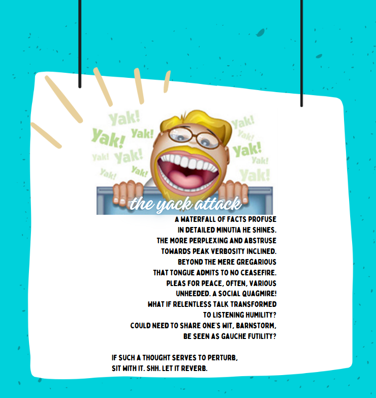 The original tale of the Bouts-rimés form has to do with a nobleman complaining of having some three hundred sonnets stolen from him. As it turns out, it wasn’t sonnets at all, only the rhyming end words. Our rhyming end words were A: profuse/abstruse/chartreuse/truce; B: incline/shine/resign/supine; C: various/gregarious/hilarious/precarious, D: ceasefire/quagmire/higher/dryer, E: transform/barnstorm/uniform/conform, F: humility/futility/nobility/tranquility; G: perturb/superb/reverb/disturb. With a couple of (horrifying) exceptions, the word list isn’t really that bad – and for once I gave myself permission to use forms of the words like inclined instead of incline. However, as there are several types of sonnets, I couldn’t really decide which would work best. I dabbled a bit writing three sonnet forms, but I found I really disliked the Terza Rima with this word list, so that one won’t ever see the light of day. Instead, here’s a Shakespearean sonnet, and a semi-Spenserian. I’ve made it a s/he poem for your amusement, but I defaulted on my illustration to HE, because we live in a sexist world, and I only found two graphics of MEN yacking, and HUNDREDS of women. (This is me, doing my bit for… equality. Or something.)