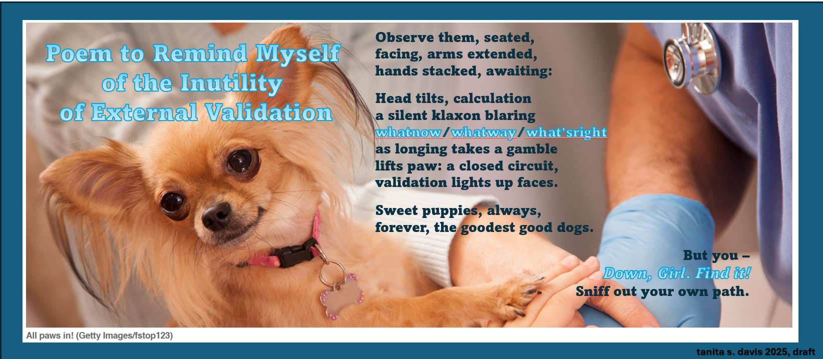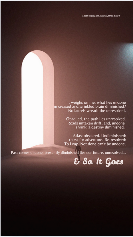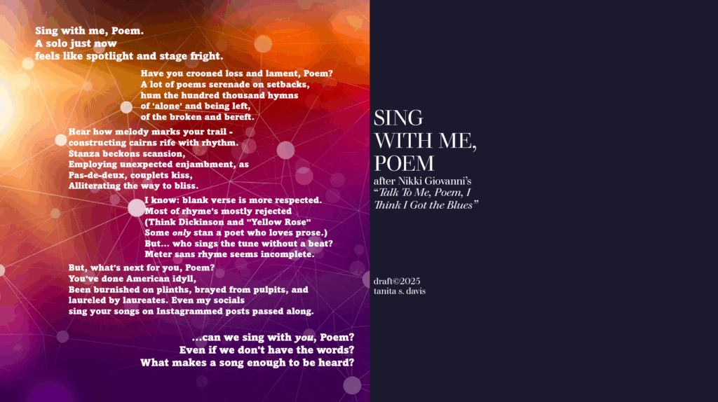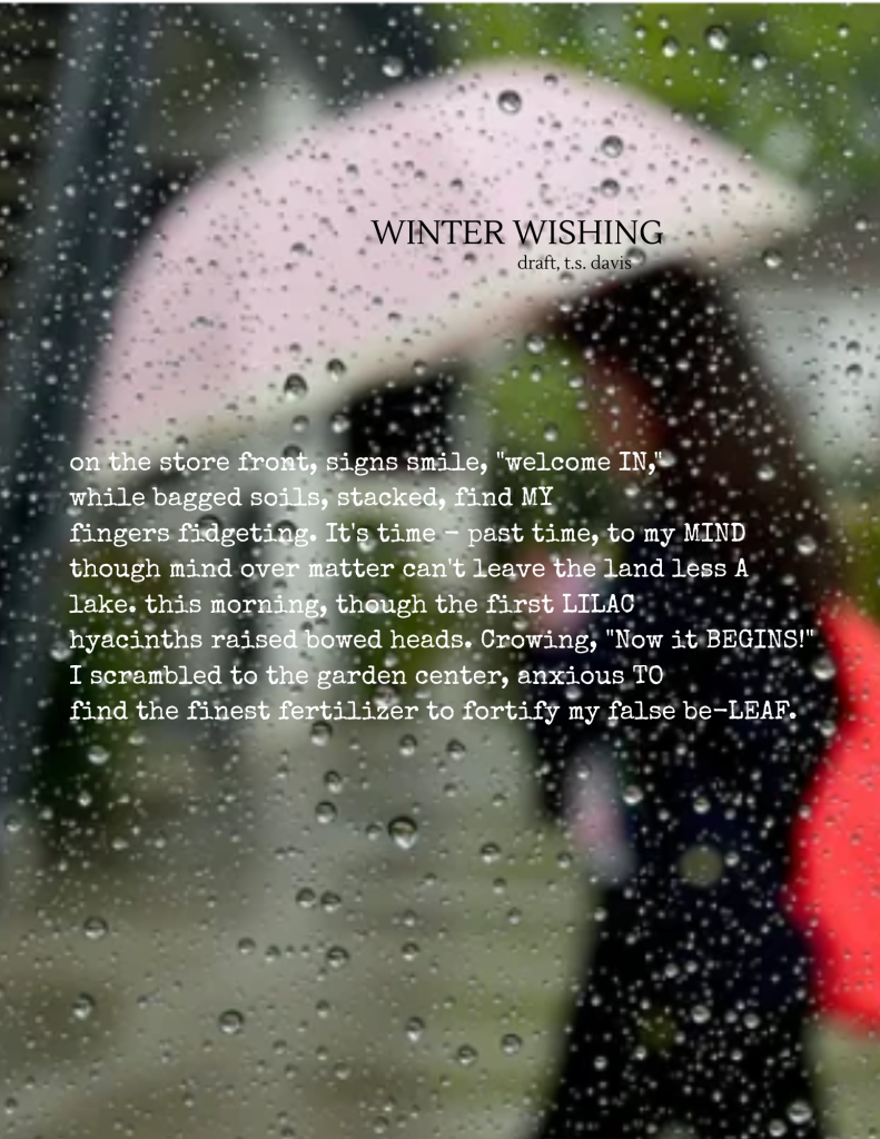 The second issue was time – and just how much this form insisted on consuming… in terms of how long I spent thinking about trochaic tetrameter and remembering what that was.😂 It’s been a minute since grad school, and I can’t honestly say when last I spelunked into the cavernous depths of poetic meter. Perhaps as an undergraduate…? In any event, a quick search reminded me – of Blake’s Tyger, of the fairies and the witches speeches in Shakespeare’s Scottish play and in “A Midsummer’s Night Dream,” and of the hard syllabic pulse of Hiawatha, which Longfellow likely meant to mimic Native American drums. The skip-stumble “falling” cadence of tetrameter in lieu of the more regular pentameter might have been second nature in 16th century Spanish, which is the original language of the ovillejo, but it was afterthought enough that I decided against attempting to use it consistently, feeling that the redondilla refrain at the end was difficult enough. The final line of the quatrain wherein previous lines are recycled came with difficulty, and the Poetry Sisters discovered during the group write that if one did not give any thought to it ahead of time, it would All Go Very Badly. We all agreed on the wisdom of beginning the poems there…