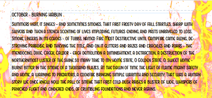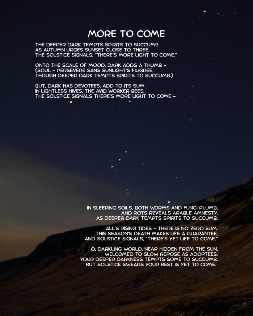 The next poem I tried to come to with fewer expectations. It obviously needed to be… the opposite of liminal. I wanted it to be unsubtle, blatant. High noon, no shade. I also decided to pry my grip off of the rules for this one. In spite of this, the second poem still has elements of twilight (which happens twice a day, despite many of us only acknowledging the evening one) and took a ton of revision and probably more time than I would normally give a poem that is meant to just be a challenge. …I’m still not fond of the dissonance the form created, so stubbornly, I kept polishing. Eventually I discovered that enjambment is actually a saving grace of this form, and I was able to move away from trying to make a workable rhyme scheme towards focusing on a smoother poetic arc and making more meaning. This is where I quit: