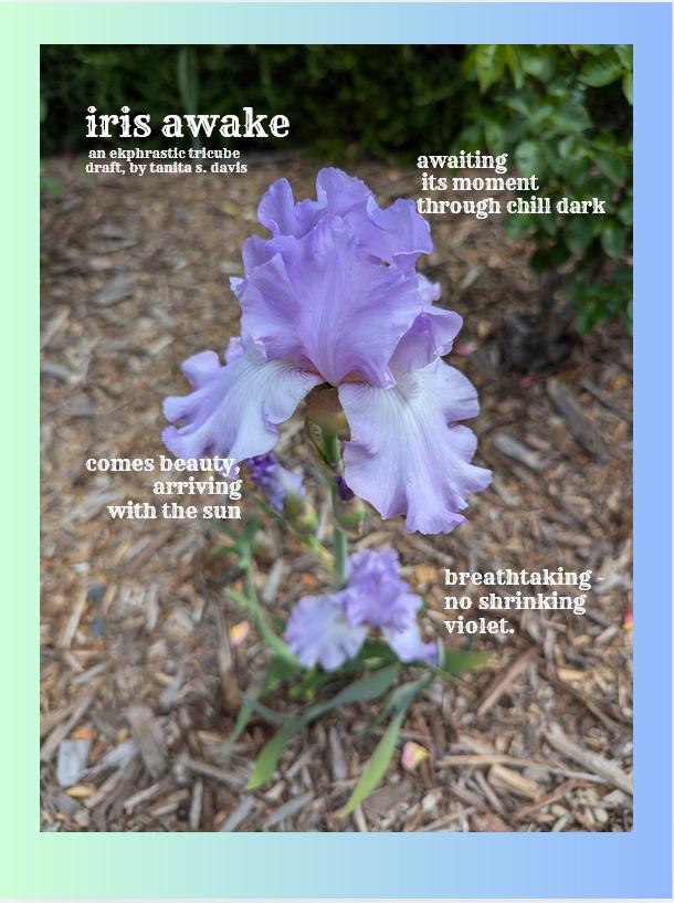 Happy National Poetry Month, Poetry Friends! Ekphrastic poetry is one of my favorite, favorite forms, simply because I am an avid photographer, using my phone far more often for its photo capabilities than its ability to connect me to anyone else. I have been mildly obsessed with Springtime in the garden of this house, as come May we’ll have been here for one year, and we’re still in the “discovery” phase. Did we know we had daffodils? Nope, not until they started showing up. Ditto for the hyacinths. Now I’ve found my new best love – bearded irises. I’m entranced.