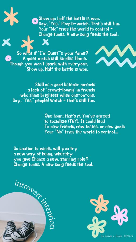 As another introvert, I so relate to you poem. Socializing is hard, but your poem gives me hope that just maybe it won’t be as bad as I fear.
