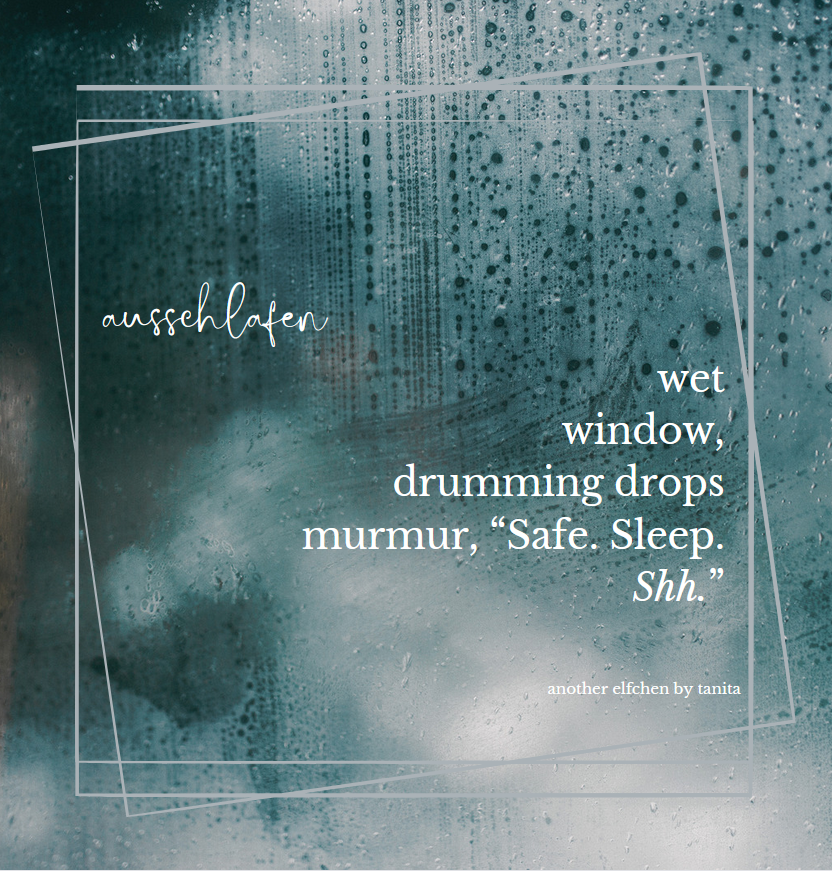 Tanita, these are all so beautiful. So thought-provoking, like your Last Spoon poem. And the beauty of the German. (The translation, for me, especially.) I love the rain drops “Safe. Sleep.” message (that period after Safe makes it so much better! Thank you for including the link to my own elfchens–how thoughtful of you to share all of our work.