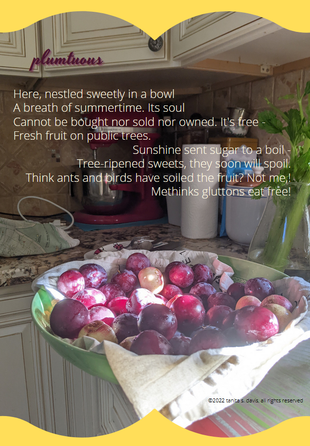 Love your ending Tanita, made me laugh, which is a sure sign of success with this challenging poem form–And great title too! Glad I squeaked out one stanza. Your fruit harvest looks delish! We have a 3-4 year old peach tree though at this point the squirrels have eaten all but about 3-4 peaches. Hope you are keeping cool, which metaphorically may be difficult after today’s Supreme Court Ruling overturning Women’s Abortion Rights, Thanks!