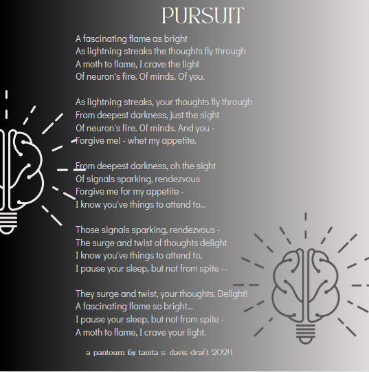 What marvelous poems your insomnia has offered you…The pantoum sure fits “Pursuit” seamlessly, what a nag pursuit is though… And, “A moth to flame, I crave your light.” what a perfect visual–so persistent is the moth as the horrid insomnia, and the rhythm in “Pursuit” is marvelous! Here’s to some good shut-eye not to far off on the horizon, thanks Tanita!
